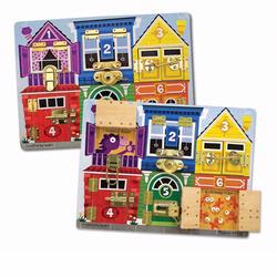 Curiosity, despite its negative reputation among cats, is quite wholesome for children - it leads children to explore and learn about their world. The insatiable inquisitiveness of your preschooler and the resulting questions may drive you a little crazy (and may lead to frequent consultation of Wikipedia for answers), but rest assured that your child's thirst for exploration is a good thing, as long as the standard safety precautions are deployed. In the meantime, toys like the Melissa & Doug Latches Board will keep your curious kiddo busy discovering the mysteries behind six doors with six different latches. Children pry and jiggle and fiddle and slide each latch on this sturdy wooden play board until they figure out the solution and find out which friendly animal's picture is revealed. Each door and each animal are a different color and have a different number, so in addition to helping your child to develop his motor skills, the Latches Board also helps kids learn their colors and numbers. You'll love the adorable retro graphics on this handcrafted toy - the bold colors, old-fashioned houses, and smiling critters remind us of the Little Golden Books we read while growing up. Recommended for children over age three. Please note: One latches board is included in each $24.99 Melissa & Doug Latches Board. WARNING: CHOKING HAZARD - Small parts. Not for children under 3 years.