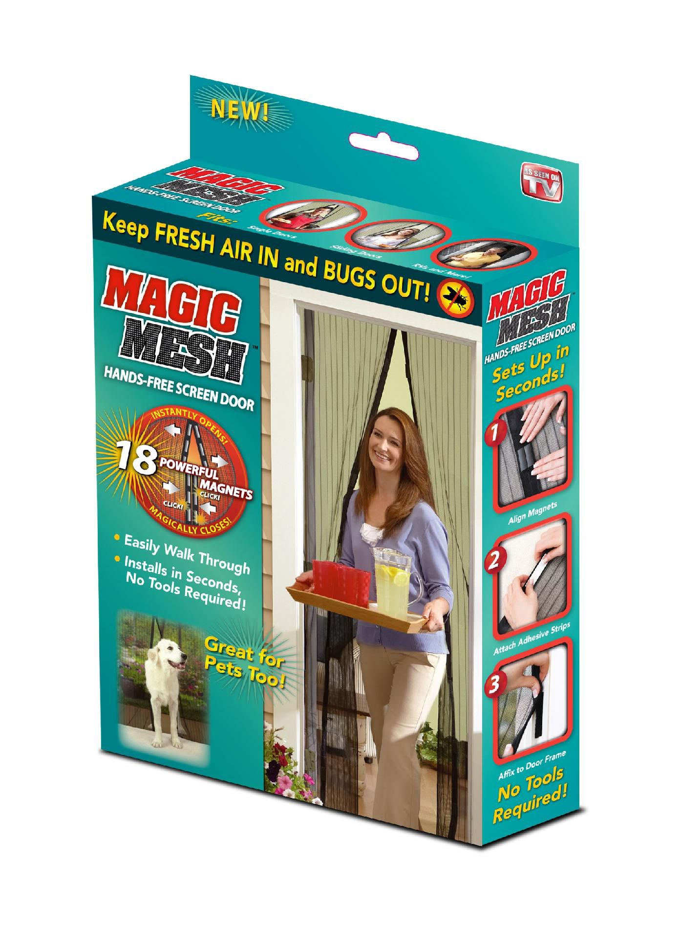 Enjoy Fresh Air And Warm Weather With Hands-Free Magic Mesh Instant Screen Door Panels In Place For Insect ProtectionSummer brings fresh air that you can enjoy more with the addition of anAs seen on TV Magic Mesh Instant Screen Door. Mother Nature s call for outdoor living is an open invitation to flying pests. The annoyance of insects dodging around ceilings and landing on counters is easily stopped with convenient coverings that go up every season. You never have to worry about closure because the magic lies in 18 strategically placed magnets that align at the center. Even with kids running in and out all day, the barrier remains firmly in place. For entertaining, you can move easily from kitchen to patio with hands full and never have to fuss over open doors. TheMagic Mesh Instant Screen Door requires no tools to install. Each two-panel set comes with tacks and a hook-and-loop system that attaches to standard door frames as well as sliding glass doors or RV entries. When pets need to go out, they no longer require assistance with netting that provides easy backyard access. Simple by design, yet amazingly functional, panel barriers are an efficient way to keep flying insects from roaming your home while everyone takes advantage of warmer weather.