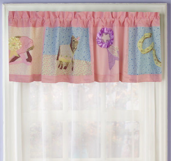 Bedding Sets. Web exclusive! This pretty pink bedding collection featuring ponies will bring sweet dreams to your little cowgirl's bed. The Giddy Up bedding set, a favorite for many years, has a blend of softer pastel colors and a horse theme. Your little cowgirl will love this quilt because it is attractive to both of her sides: The side that loves to ride and the side that still likes to be pretty and pink. Sold separately, choose from the following accessories: Bedskirt - twin, queen; polyester platform, 14" cotton drop Sheet set - twin, queen; Cotton with elastic edge Drapes with tiebacks - 42" x 84" Decorative pillow with polyester fill Valance with rod pockets 3-piece quilt mini-set; full/queen - cotton shell, polyester fill 2-piece quilt mini-set; twin - cotton shell, polyester fill Imported