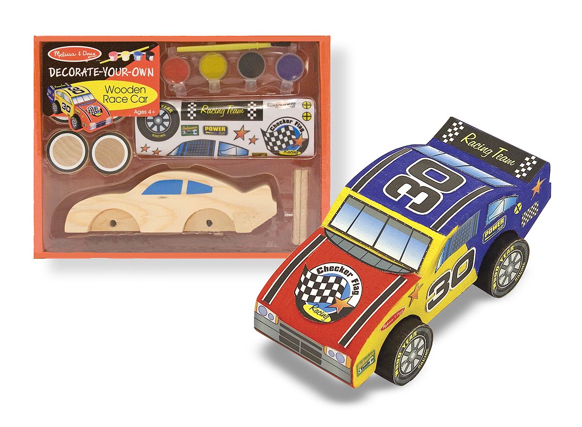 online Melissa & Doug Decorate-Your-Own Wooden Race Car The best toys are the ones that kids make for themselves, because they're 100% unique. No other toy race car in the world will look exactly like your child's Decorate Your Own Wooden Race Car by Melissa & Doug. First, assemble the car by attaching the wood wheels and axles to the wood car body. Then, paint it to your specifications. Then, add the finishing touches with stickers. And finally: play! This is a great activity for a rainy afternoon or a birthday party. Includes the pieces for one race car, four coordinating paint colors (red, yellow, black, blue), a paint brush, and stickers. Recommended for ages 4 and up. WARNING: CHOKING HAZARD - Small parts. Not for children under 3 years.