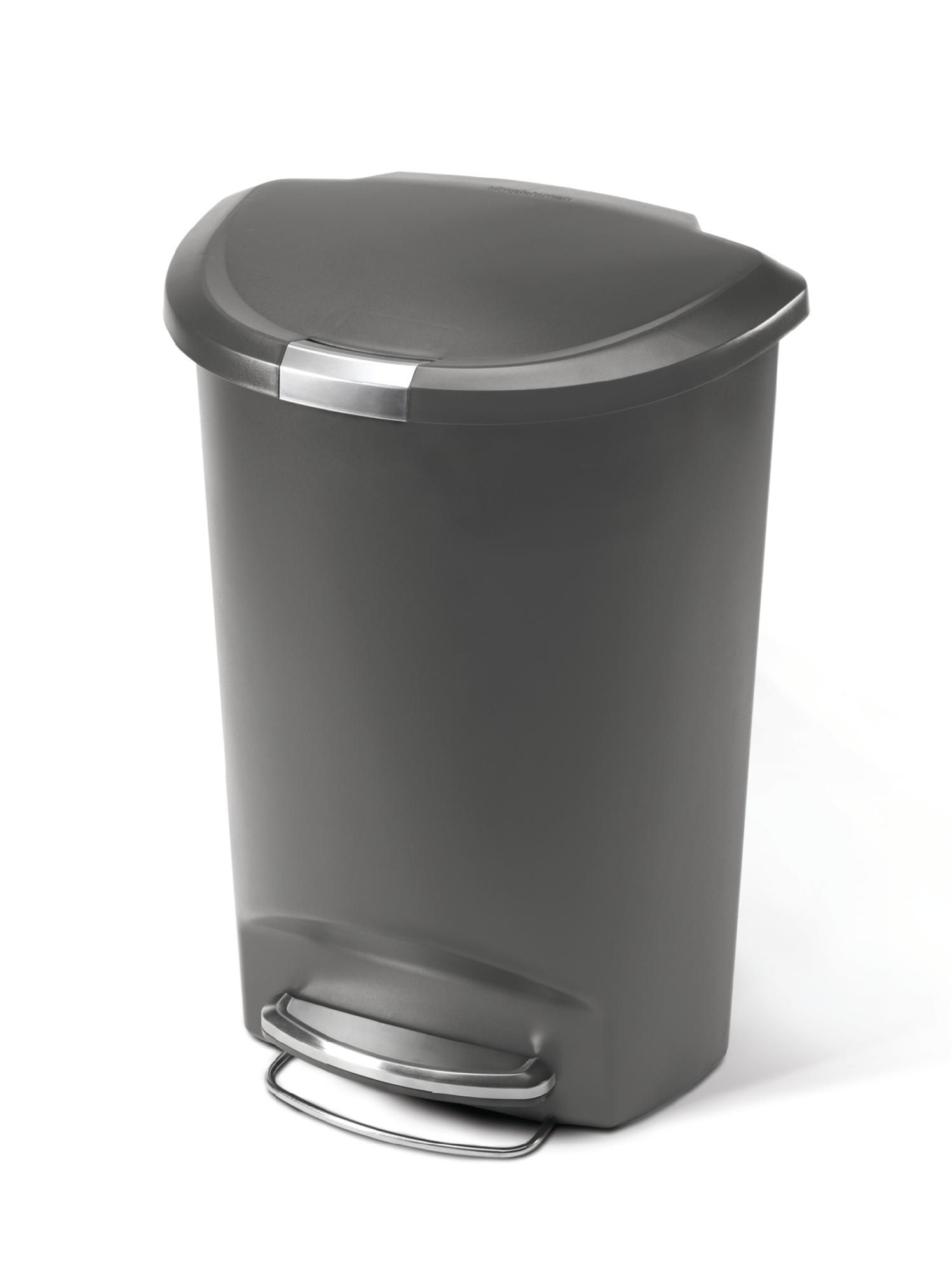 13 Gallon Trash Can Semi RoundA great value for any kitchen, the simplehuman rectangular plastic step can has features unprecedented for a plastic can. Simplehuman s proprietary lid shox for a smooth, silent close and a slide lock that helps keep the lid from being accidentally opened by kids or pets. A steel-accented pedal adds durability and an integrated handle make the can easy to move. Features: Our patented lid shox technology controls the motion of the lid for a slow, silent close. Lock the lid shut to help prevent pets from opening the lid. Engineered for a smooth and easy step. Slimmer than traditional hinge designs allows you to place the can closer to the wall. Keep the lid open whenever you need it great for long chores. We all have daily tasks we want to do faster, things that take up too much space, and projects we want to organize. Simplehuman is committed to designing products that help efficiently achieve these goals.